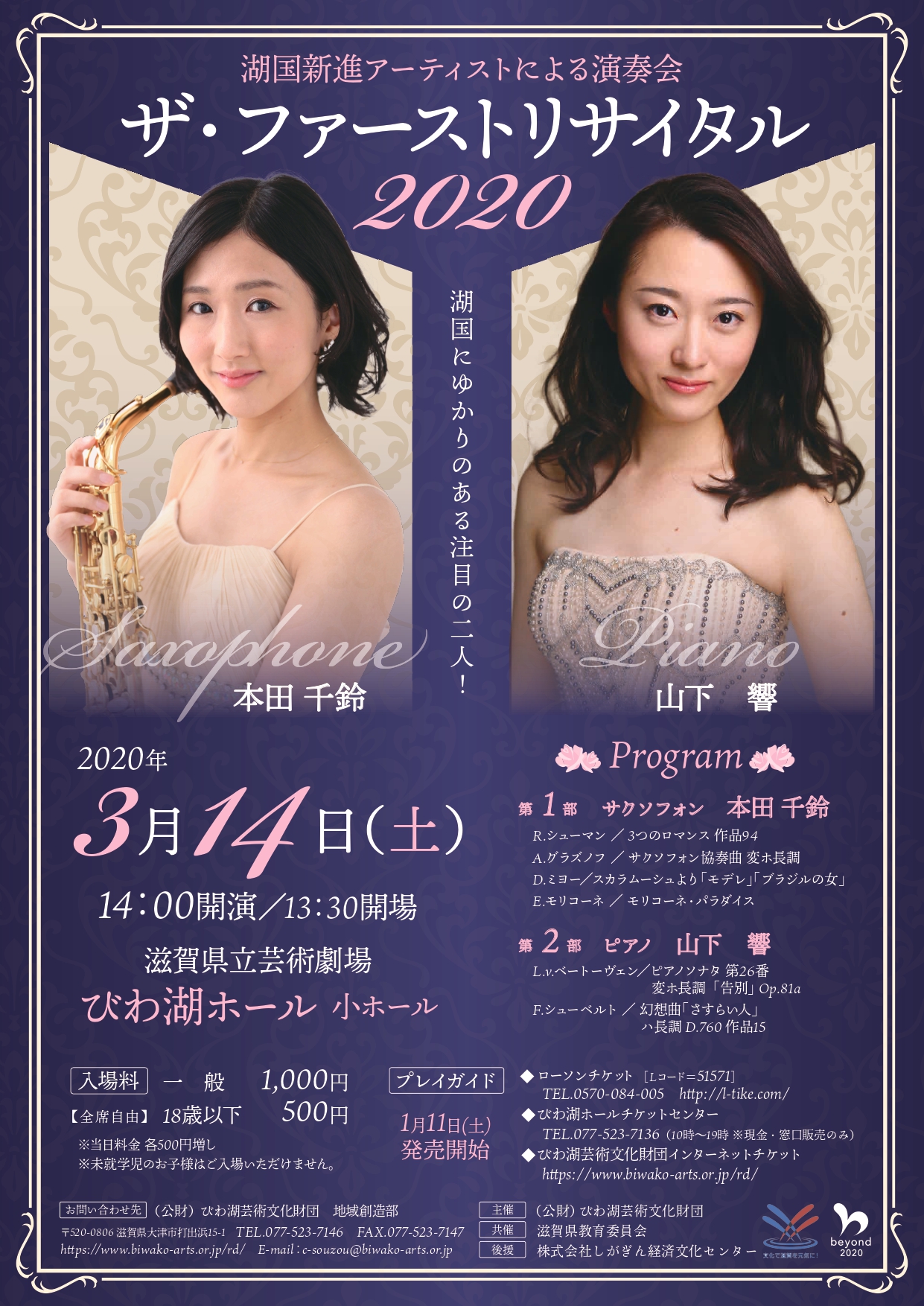 - びわ湖ホール チケットセンター (10:00~19:00 火曜日休館、現金・窓口販売のみ)