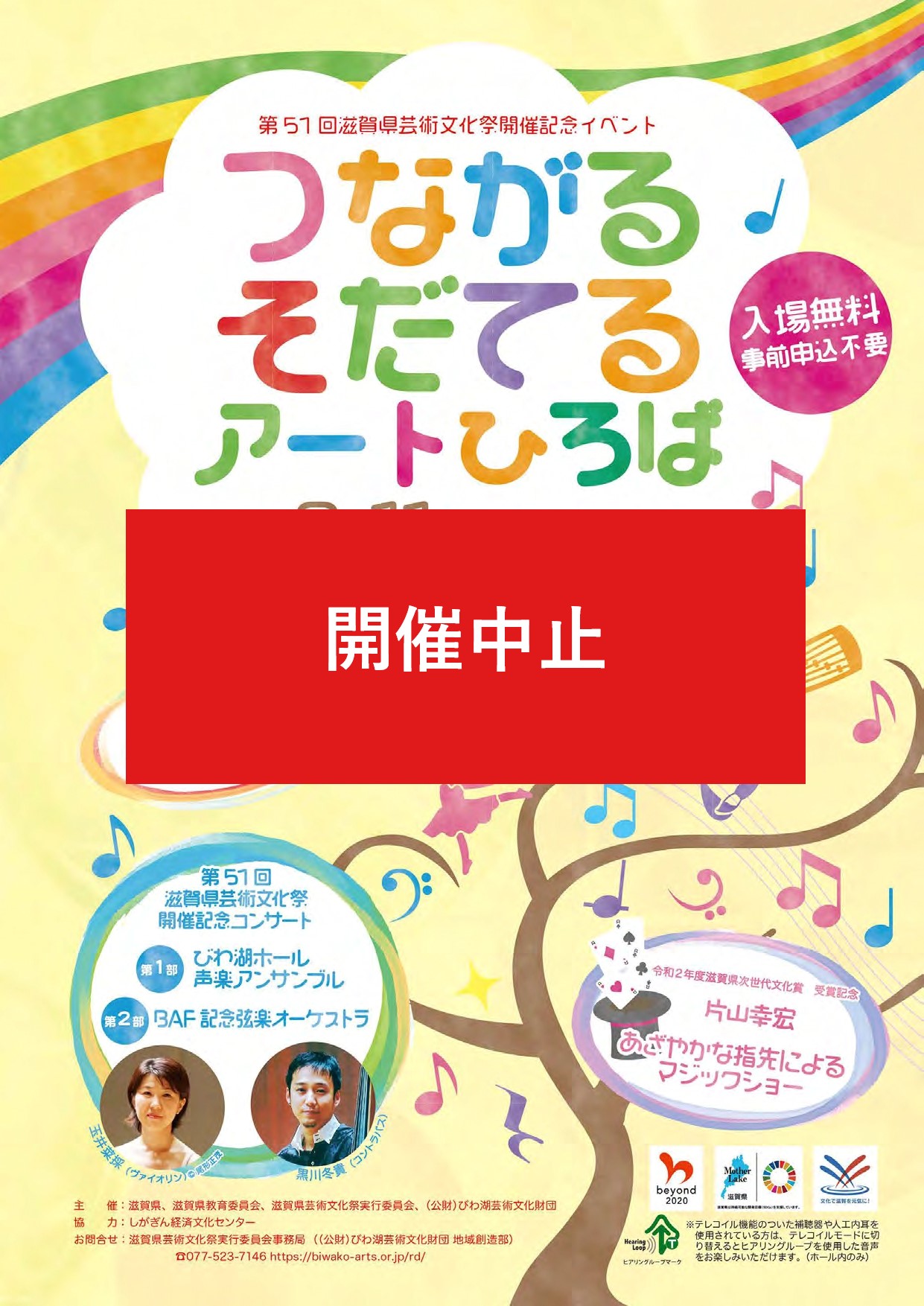 県内における新型コロナウイルス感染症の感染拡⼤および本県への緊急事態宣⾔の発令に伴い、第51回滋賀県芸術文化祭開催記念イベント「つながる そだてる アートひろば」の開催を中⽌いたします。