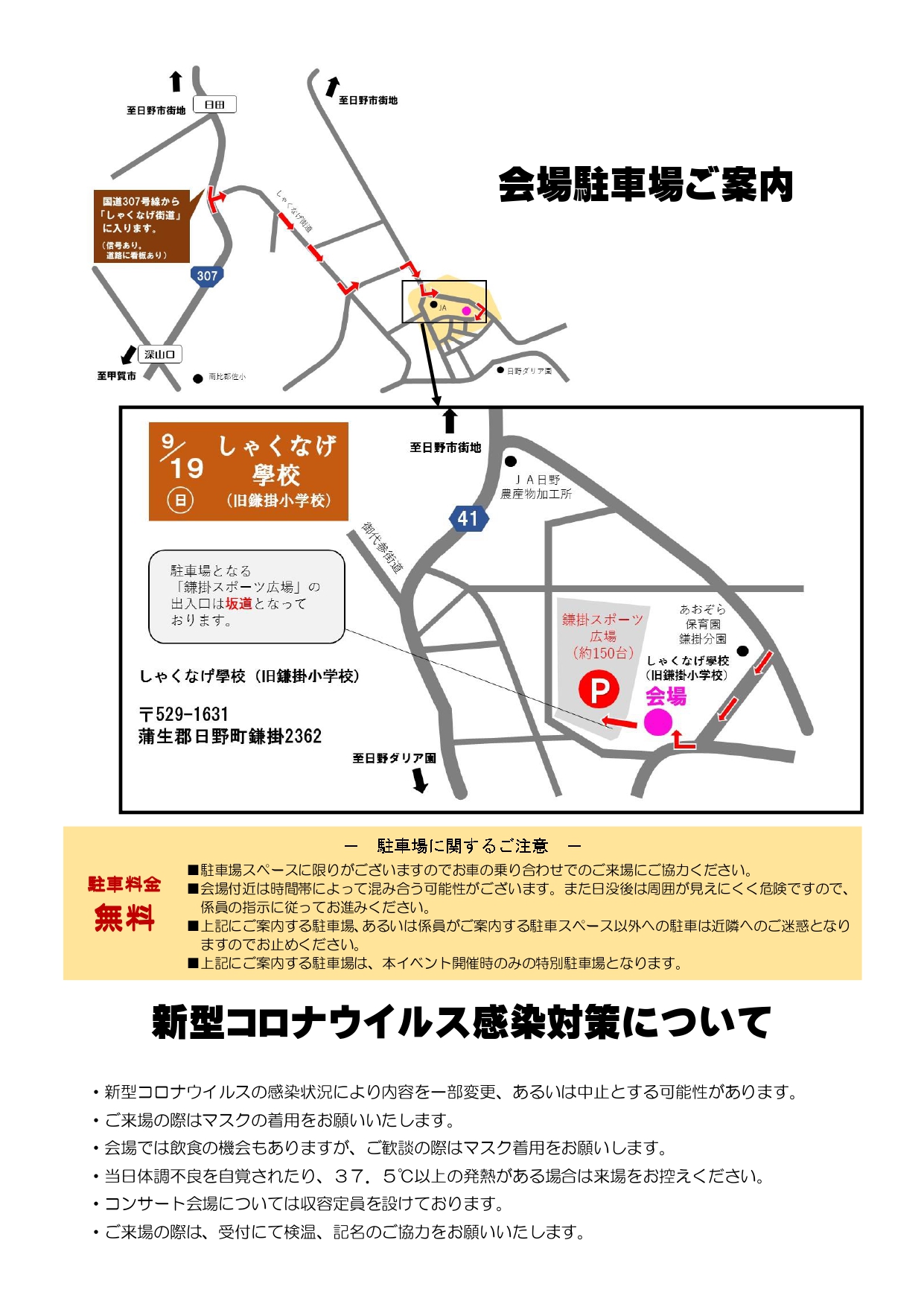 - 駐車スペースに限りがございますのでお車の乗り合わせでのご来場にご協力下さい。