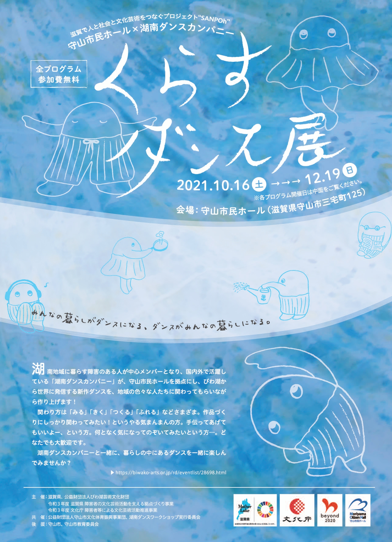 湖南地域に住む障害のある人が中心メンバーとなり、国内外で活躍している「湖南ダンスカンパニー」が、この度、守山市民ホールを拠点にし、びわ湖から世界に発信する新作ダンスを、地域の色々な人たちに関わってもらいながら作り上げます!