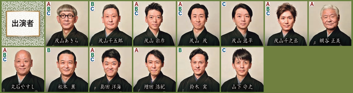 茂山千之丞。1986年初舞台。2018年三世千之丞を襲名。語学に堪能で国内外でバイリンガル狂言公演を行う。作・演出を手がける「新作” 純”狂言集マリコウジ」、「ヒャクマンベン」を主宰。狂言以外にも最近では「三代目、りちゃあど」、「ゴドーを待ちながら」に出演。2019年第37回京都府文化賞奨励賞受賞。