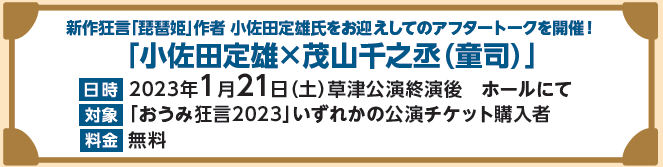 新作狂言「琵琶姫」作者 小佐田定雄氏をお迎えしてのアフタートークを開催します。