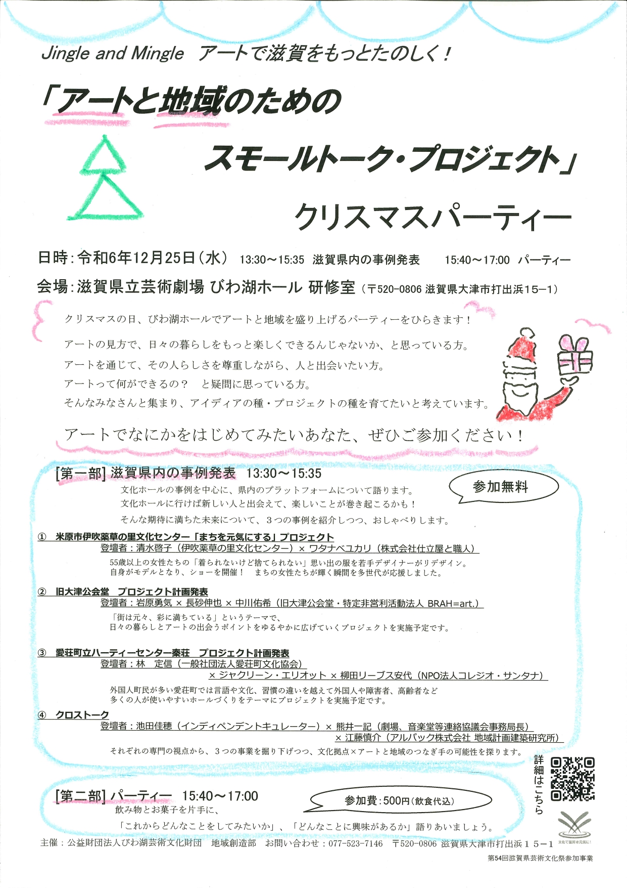 クリスマスの日、びわ湖ホールでアートと地域を盛り上げるパーティーをひらきます!アートの見方で、日々の暮らしをもっと楽しくできるんじゃないか、と思っている方。日々の暮らしを新しく捉えてみたい方。アートで人と出会い、その人のその人らしさを大切に、つながりあっていきたい方。アートで何ができるの? と疑問に思っている方。そんなみなさんと集まり、アイディアの種・プロジェクトの種を育てたいと考えています。