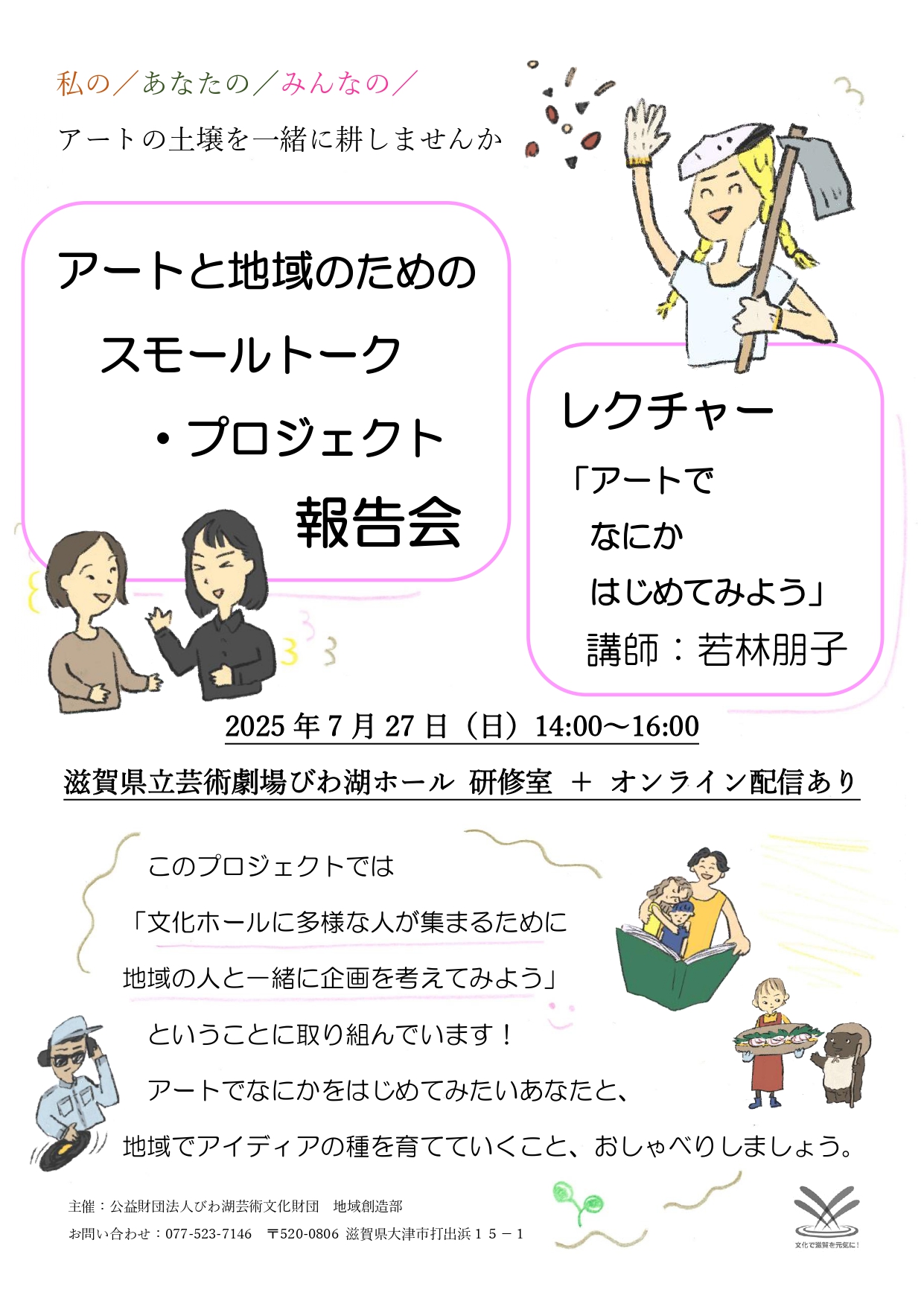 「アートと地域のためのスモールトーク・プロジェクト」では令和6年度と7年度の二年間に渡り、「文化ホールに多様な人が集まるために地域の人と一緒に企画を考えてみよう!」というテーマで、リサーチやワークショップを開催してきました。 滋賀県内で2か所、旧大津公会堂と愛荘町立ハーティーセンターを拠点にし、旧大津公会堂では、大津地域で表現活動をしている人たちと一緒に“まちの中で表現の場所を広げるための小さな実践”を考え、愛荘町立ハーティーセンター秦荘では、“外国人住民がもっと文化ホールを楽しむためには”というテーマに取り組みました。 このイベントでは、「アートと地域のためのスモールトーク・プロジェクト」の実践の報告と、プロジェクト・コーディネーターの若林朋子さんを招いて、「アートでなにかはじめてみよう」をテーマにレクチャーを行います。