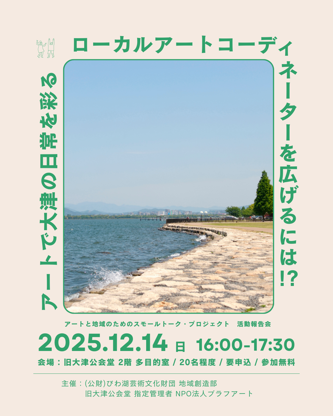 本企画では、大津のまちをアートで彩ることを目的に活動をしています。 令和7年度は、インディペンデントキュレーターの池田佳穂さんにご協力をいただき、 市民の皆さんと一緒にまちあるきをしながら、「アートの見かた」「アートの魅せかた」を学びました。 それらの学びを踏まえ、12月に旧大津公会堂の近隣店舗に協力を依頼し、「みせなかArt Exhibition」を開催します! 今回は、それらの活動報告とあわせて、まちなかでアートをコーディネートしていく「ローカルアートコーディネーター」の広がりについて、成安造形大学の石川亮先生をゲストに迎えて、トークを行います。