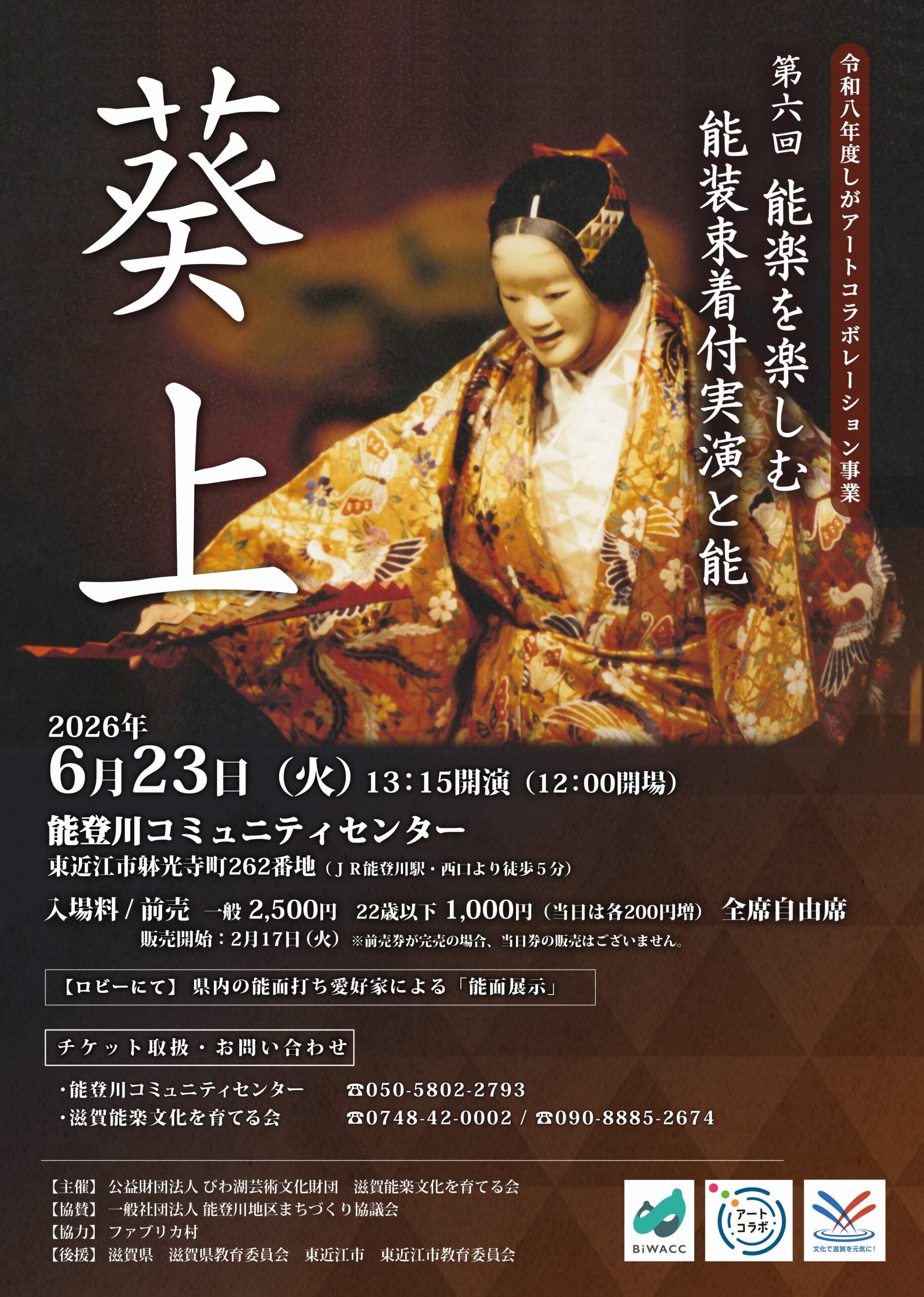 | 主催 | びわ湖芸術文化交流センター/BiWACC(公益財団法人びわ湖芸術文化財団 地域創造部)、滋賀能楽文化を育てる会 |