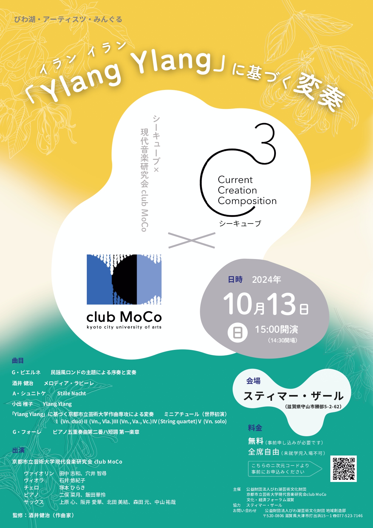 本公演で委嘱作品を発表する小出稚子さんの作品『Ylang Ylang』を主題に、京都市立芸術大学作曲専攻の学生の皆さんによる小品集が世界初演されます。そのほかサクソフォン四重奏やピアノ五重奏など、色鮮やかなプログラムをお届けします。