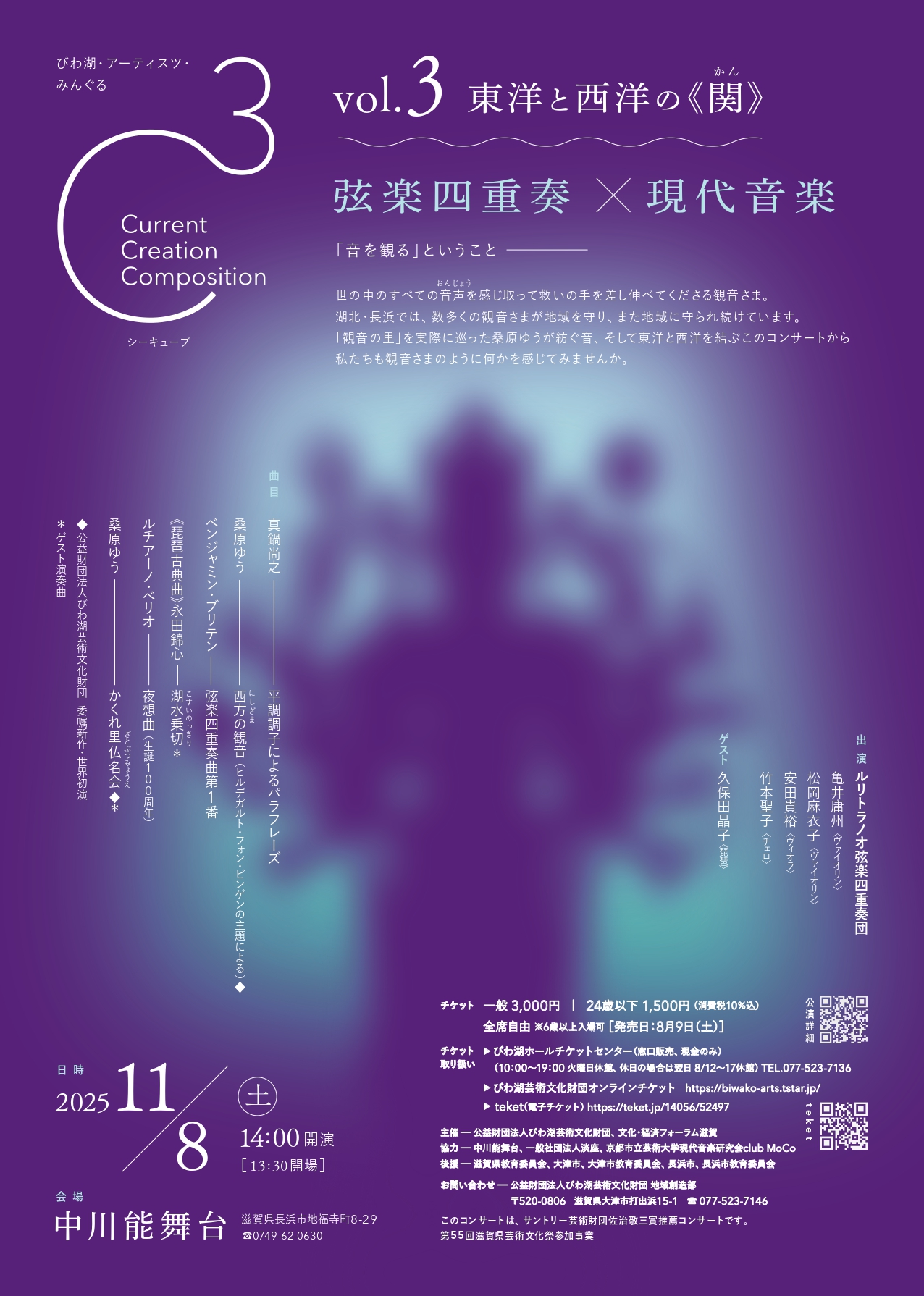 | チケット取扱 | ・びわ湖ホールチケットセンター(現金、窓口販売のみ) TEL 077-523-7136 / 10:00〜19:00 休館:火曜日(休日の場合は翌日)、8/12〜8/17 ・びわ湖芸術文化財団オンラインチケット https://biwako-arts.tstar.jp ・teket https://teket.jp/14056/52497 |