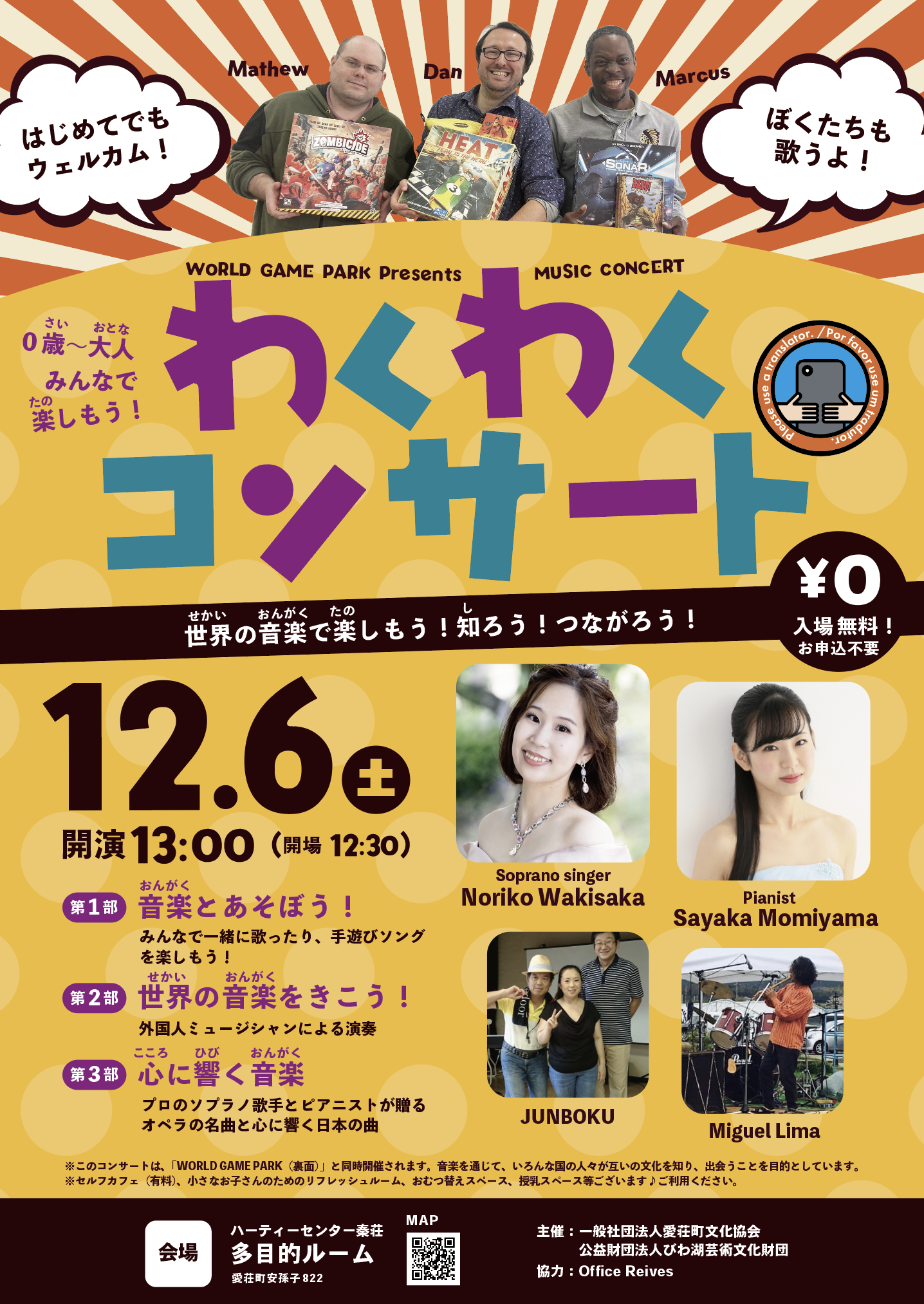 このコンサートはWORLD GAME PARKと同時開催されます。音楽を通じて、いろんな国の人々が互いの文化を知り、出会うことを目的としています。