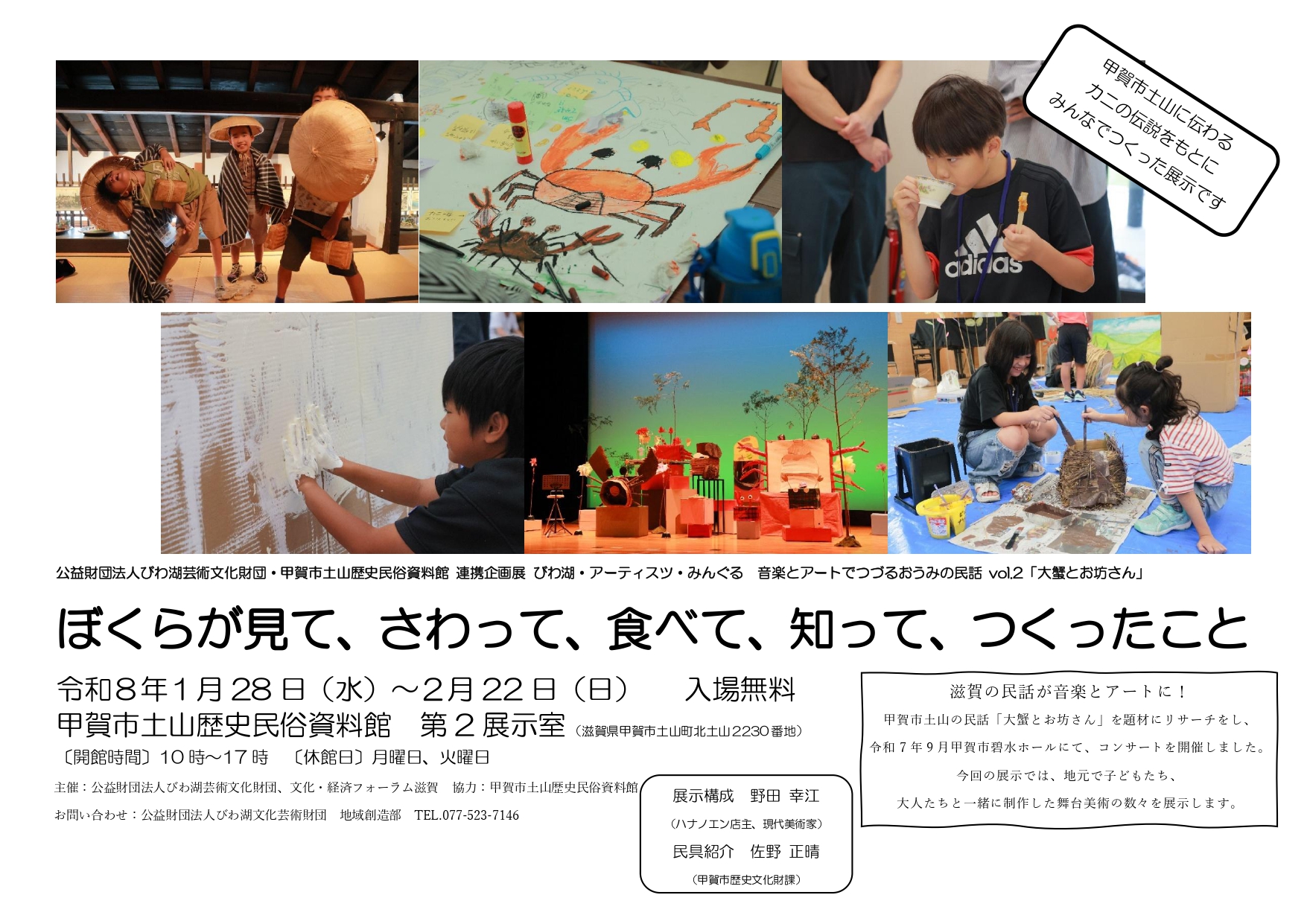 - 公益財団法人びわ湖芸術文化財団・甲賀市土山歴史民俗資料館 連携企画展 びわ湖・アーティスツ・みんぐる 音楽とアートでつづるおうみの民話 vol.2「大蟹とお坊さん」 ぼくらが見て、さわって、食べて、知って、つくったこと